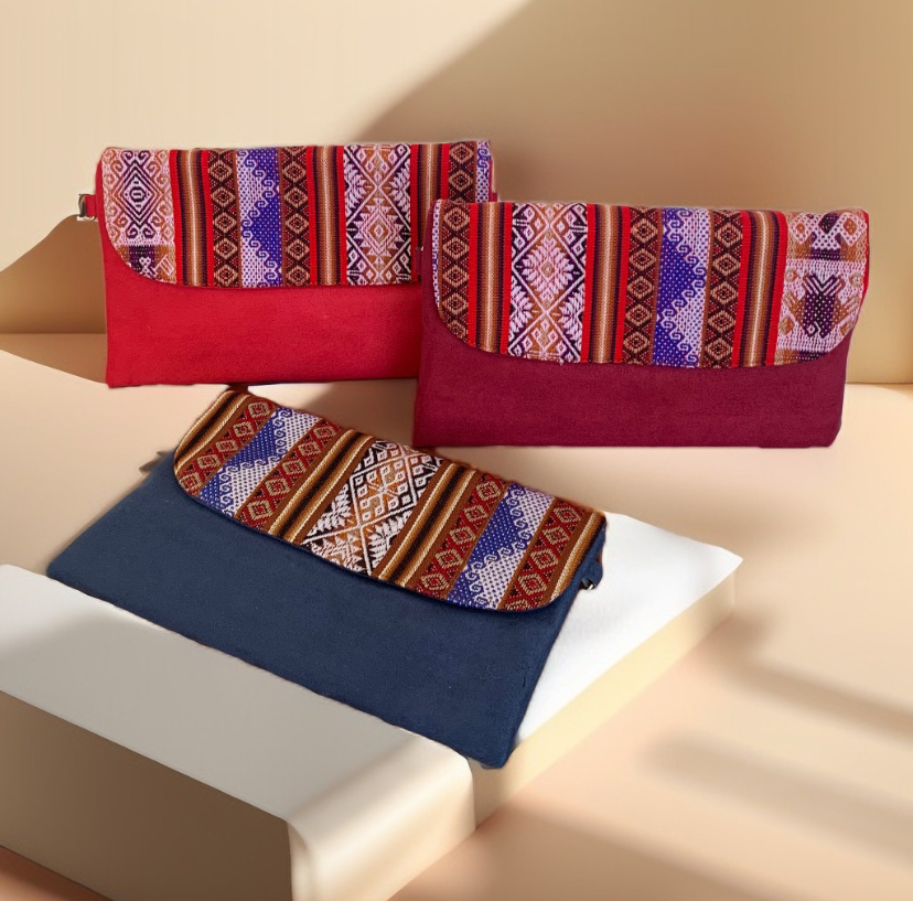 Bolsa Carteira em Camurça e Manta Peruana com alça de mão tipo pulseira e alça tiracolo, feita artesanalmente, inspirada na tradição andina, foi construída para suportar os rigores do uso diário, mantendo ao mesmo tempo a sua estética encantadora. Esteja você em busca de uma bolsa que traga um elemento de sofisticação boho, uma bolsa clutch para reuniões mais sofisticadas ou uma bolsa crossbody hippie chic que exala uma sensação de liberdade e alegria.
