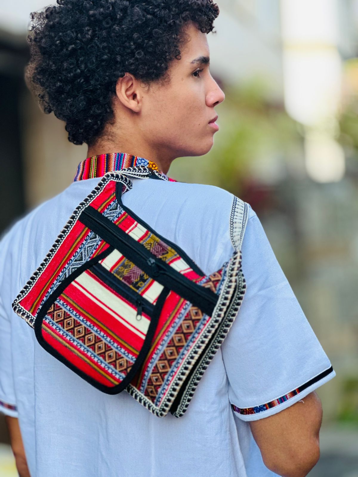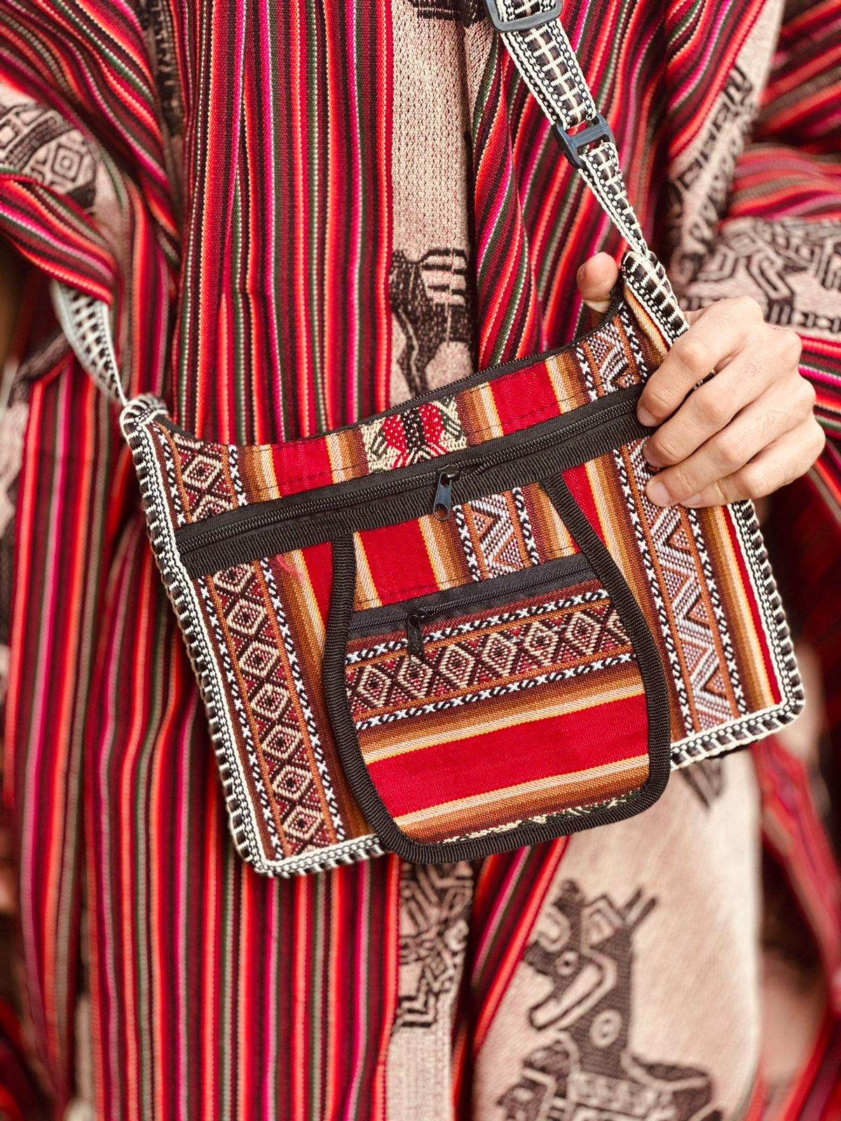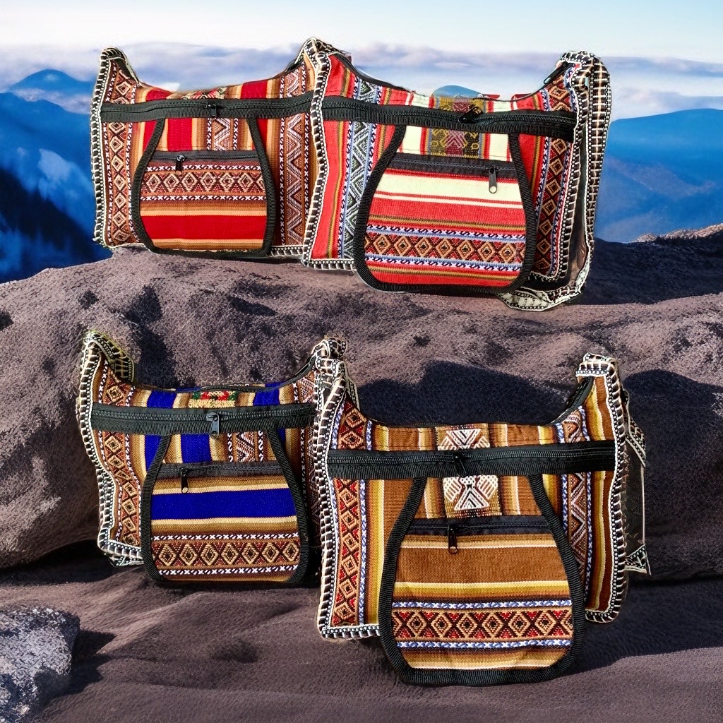 Bolsa Unissex com cores e estampas do folclore andino apresenta design único e colorido, portanto, um acessório único. A Bolsa tem tamanho grande, oferecendo bastante espaço para todos os seus itens. Além disso, toda forrada por dentro com bolsa frontal com ziper e alça regulável projetada para dar  conforto, permitindo que você a use o dia todo no ombro ou transpassada sem complicações.