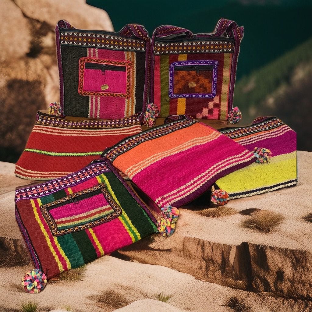 Bolsa Aguayo, artesanal, em lã de ovelha, modelo transversal, estilo Boho, feita em tear manual atraves de técnica ancestral, traz a mistura de cores naturais e vibrantes que representa a cultura andina. Bolsa muito colorida e feita com amor pelas artesãs do Peru na técnica ancestral e tingida com corantes 100% naturais da região andina. A bolsa apresenta uma vibração hippie alegre com design de listras com alternância de larguras caracteristicos do Aguayo andino.