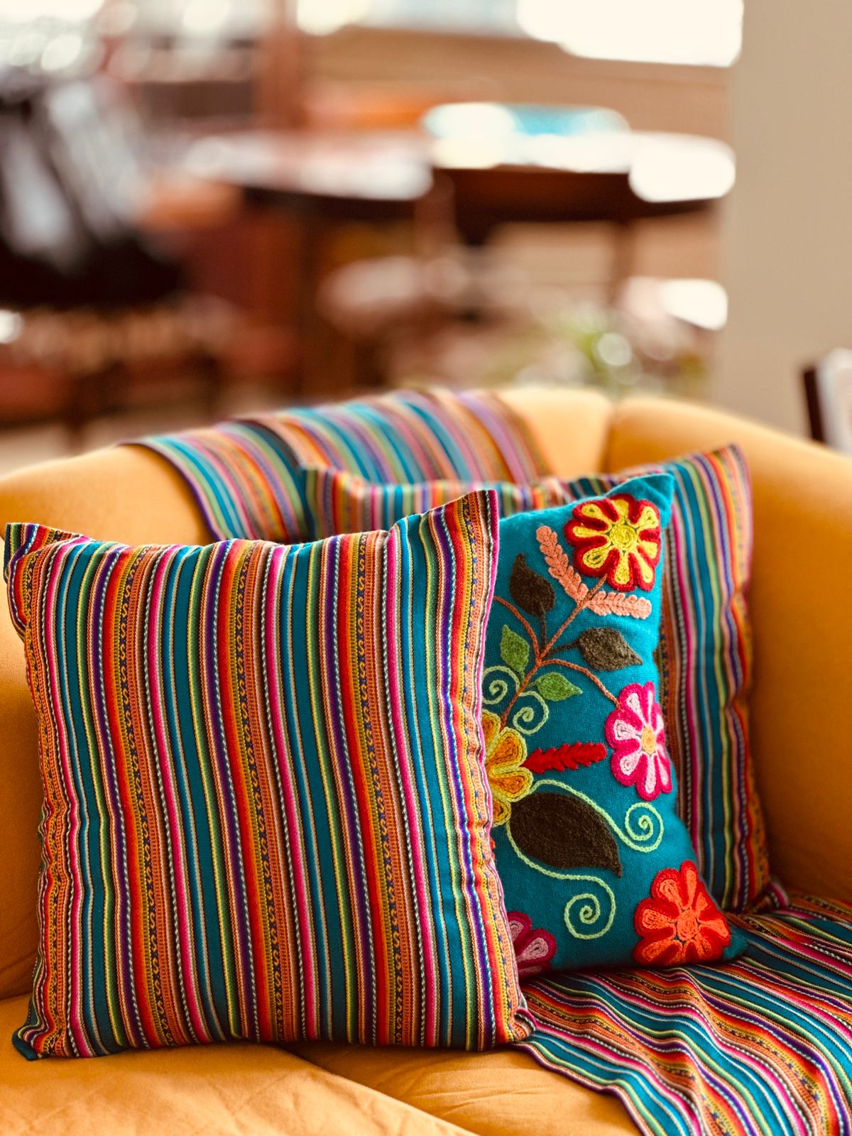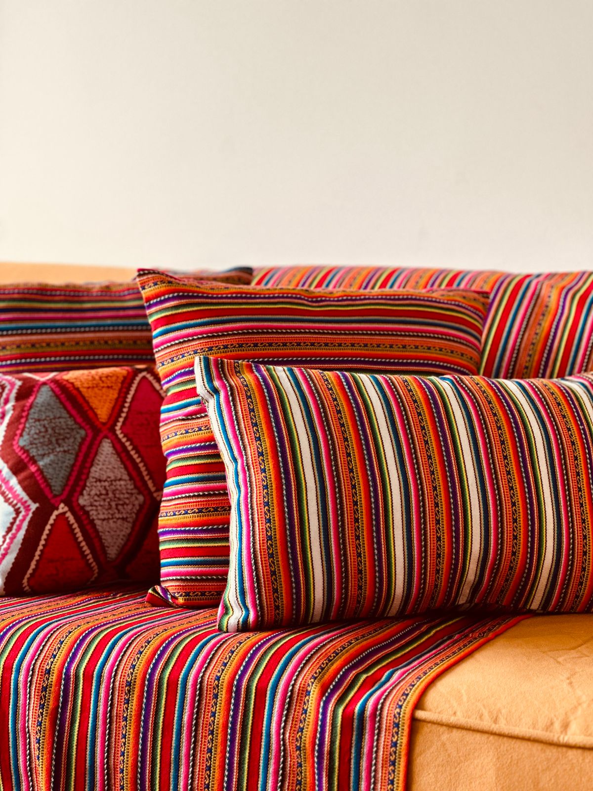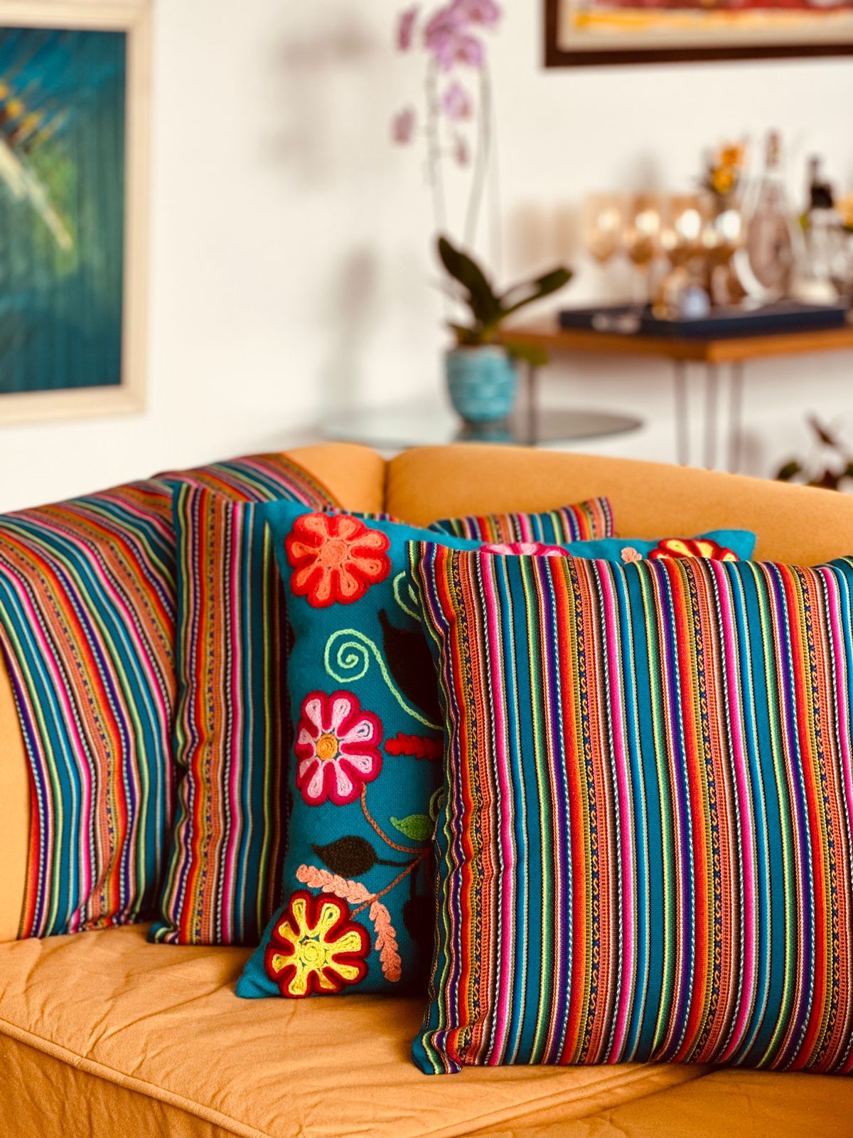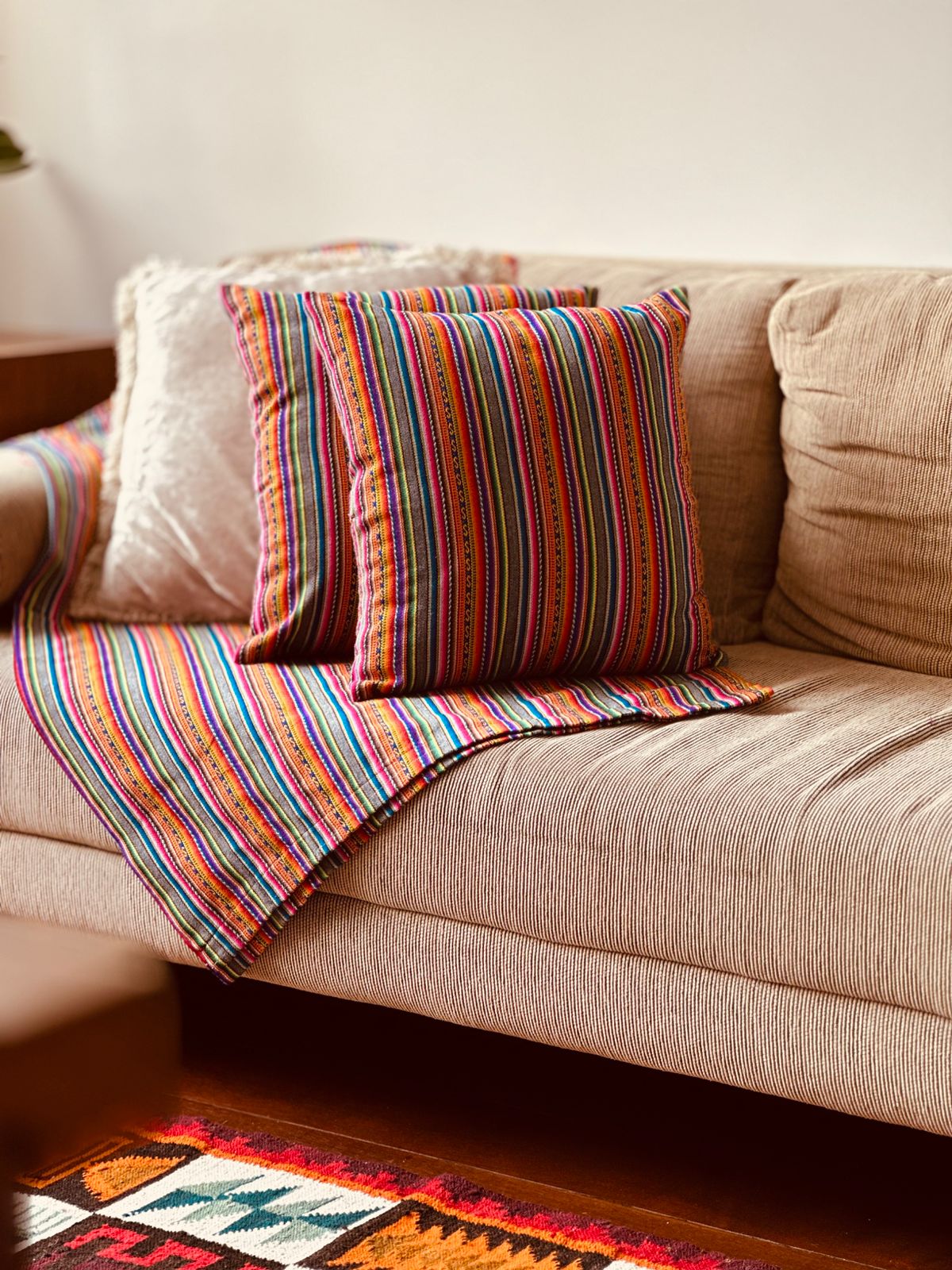 Adicione um toque boho chic à sua casa com nosso atraente conjunto de Manta e 02 Capas de Almofada com estampa peruana tradcional feitas em tecido andino peruano tradicional . As cores vibrantes e brilhantes somados aos designs intrincados inspirados nos símbolos usados pelos povos do Peru, são típicos dos Andes e farão qualquer ambiente se destacar, dando ao seu espaço um toque único e pessoal.